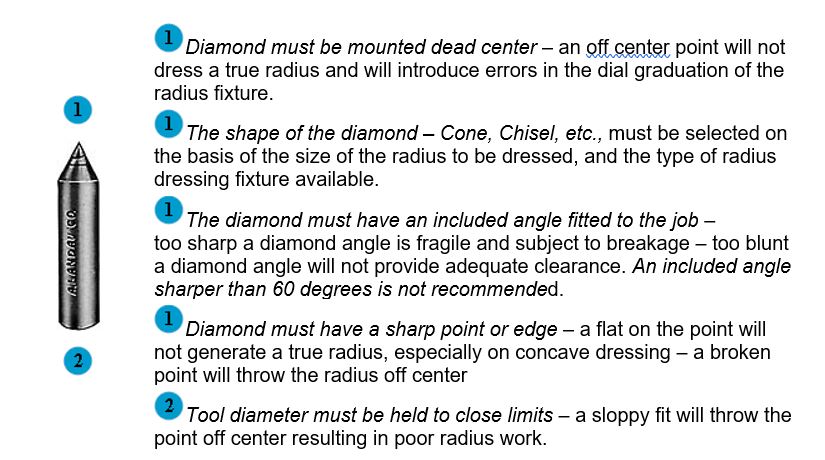 Developing a good radius depends on the proper diamond tool and the correct radius dressing fixture. There are a great many factors that must be considered in selecting the proper diamond tool –but it is equally important to use the proper dressing fixtures. Every important requirement for good radius dressing is shown below – neglect of any single factor will result in an imperfect radius.