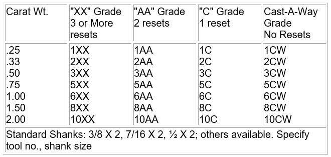 The SIZE and QUALITY of the diamond used for a straight dressing operations should be selected on the basis of the grinding wheel characteristics; its’ diameter, width, grain size and composition. The finer grains and harder bonds used in grinding wheels require better qualities of Industrial Diamonds for dressing than the coarser grain, relatively softer grinding wheels. We supply four general qualities of Industrial Diamonds in our straight dressing tools, namely; Grades “AA”, “XX”, “C”, and CW.